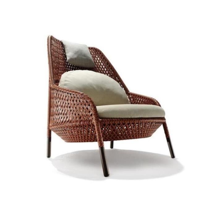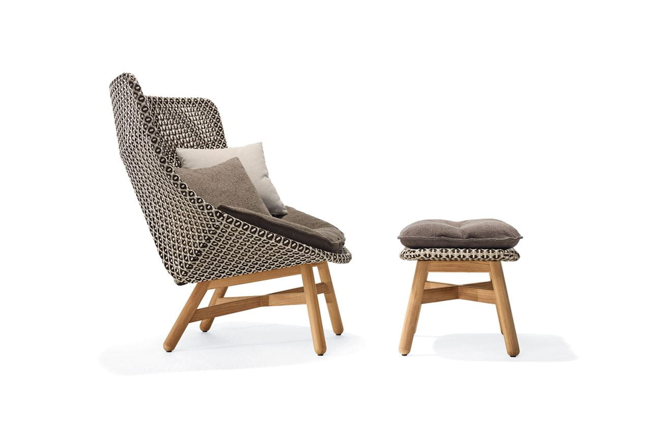 Die AHNDA Kollektion umfasst Sessel, Hochlehner sowie einen passenden Hocker und Kaffeetisch. Die Möbel sind aus wetterfester DEDON Faser gefertigt und das ‚transparente‘ Design vermittelt ein Gefühl von Leichtigkeit.