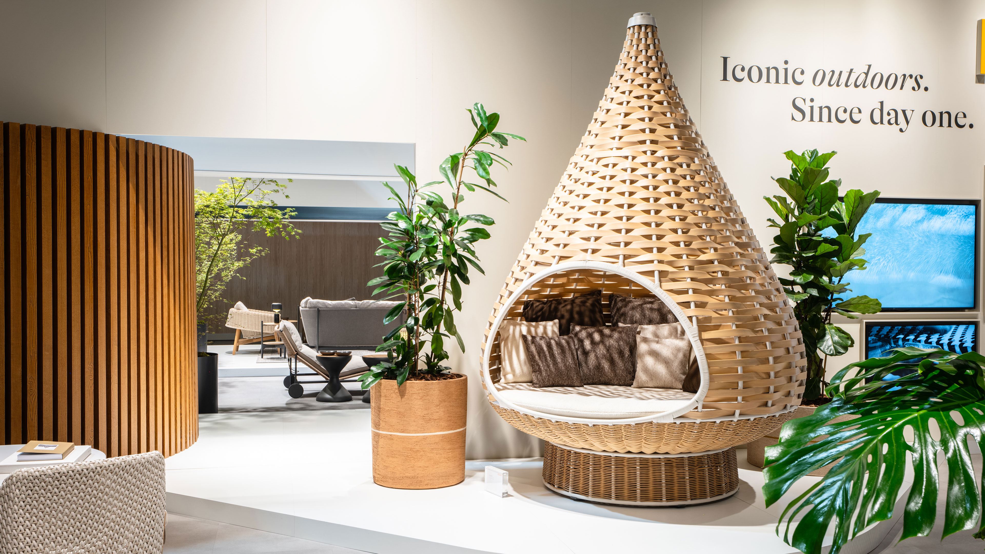 This vision extends to our booth, a thoughtful evolution rather than a one-time installation. Large-scale handwoven curtains showcase the versatility of DEDON Fiber, celebrating craftsmanship, shaping an immersive sensory experience, and expanding into a new category of DEDON creations.