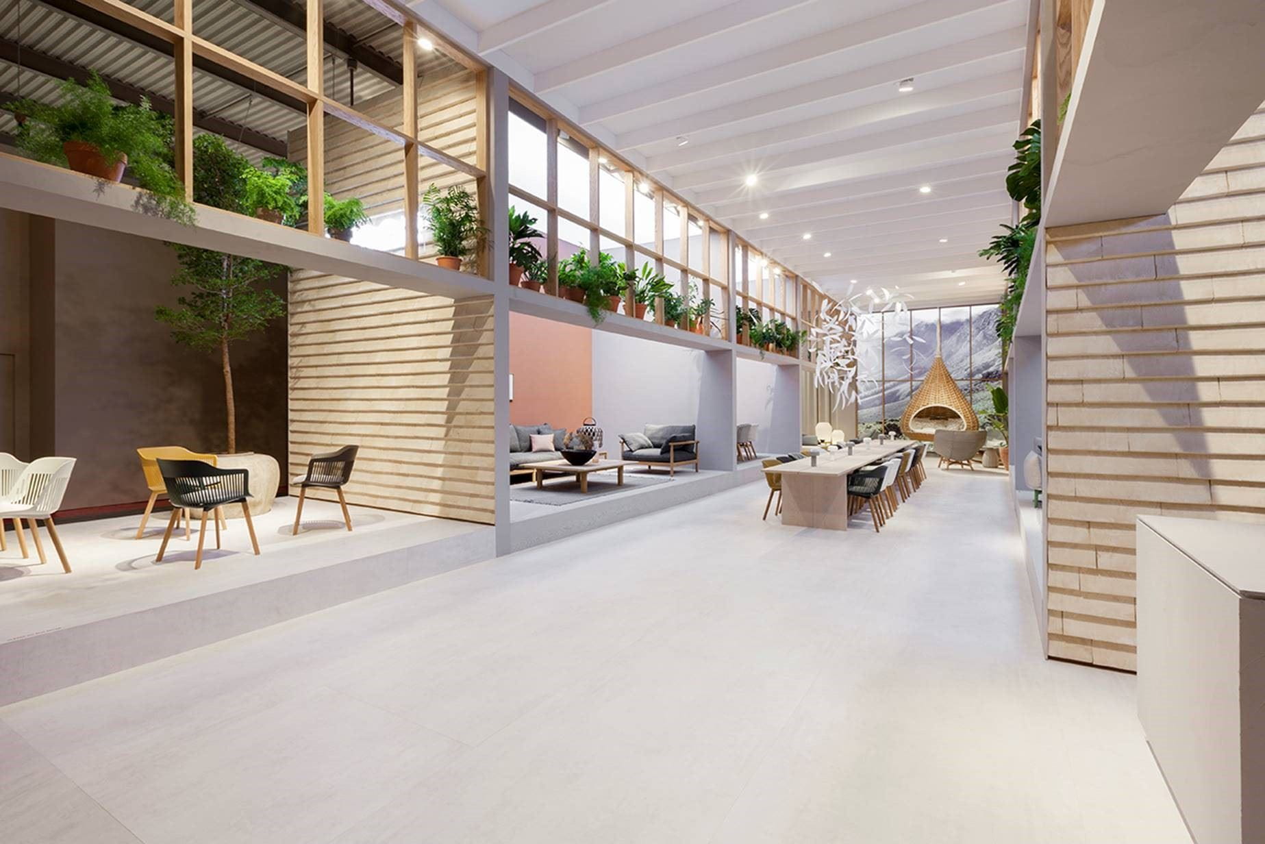 Das Ergebnis ist ein lichtdurchfluteter Raum, der Natürlichkeit und Ruhe ausstrahlt. Der Hauptbereich, der sich über die gesamte Tiefe des Messestands erstreckt, wird durch eine hohe Decke, klare Linien und ein großes, rückseitig beleuchtetes „Fenster“ bestimmt, das den warmen Eindruck einer natürlichen Lichtquelle vermittelt. Kleinere Bereiche auf beiden Seiten bilden luftige Ausstellungsflächen.