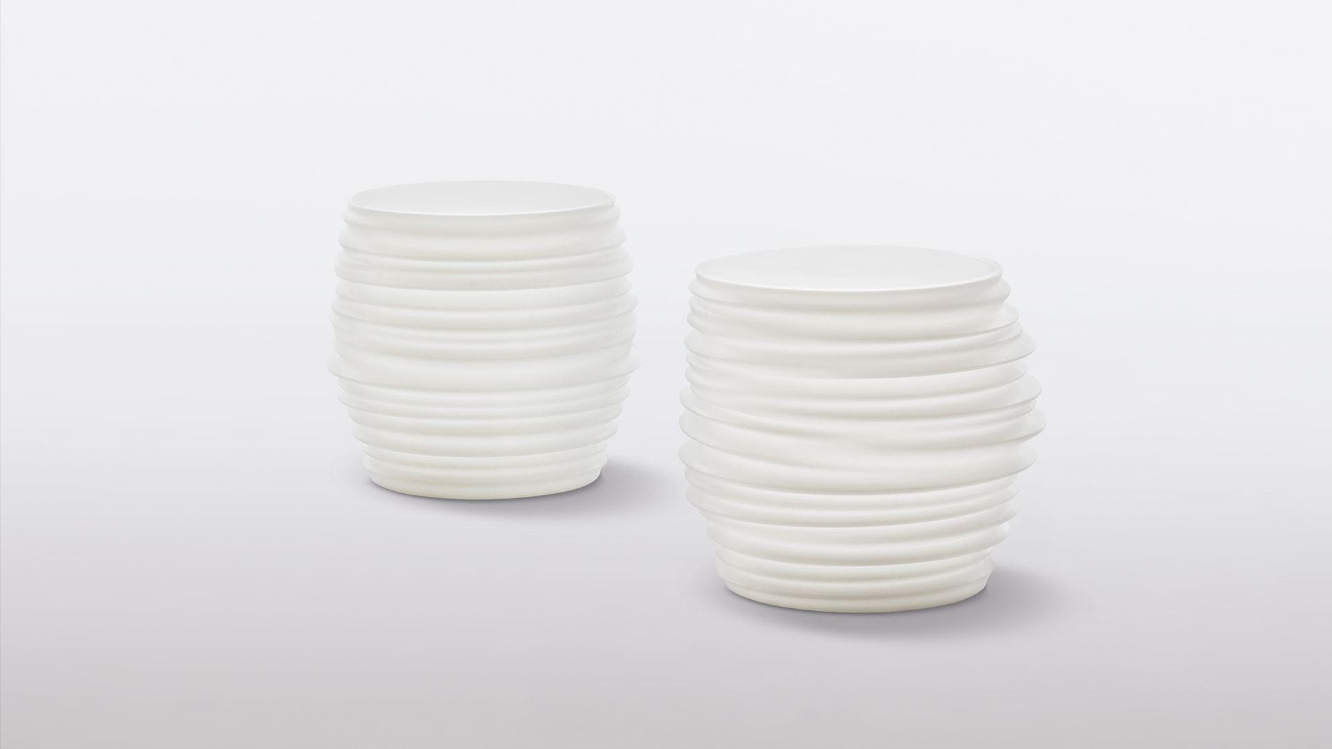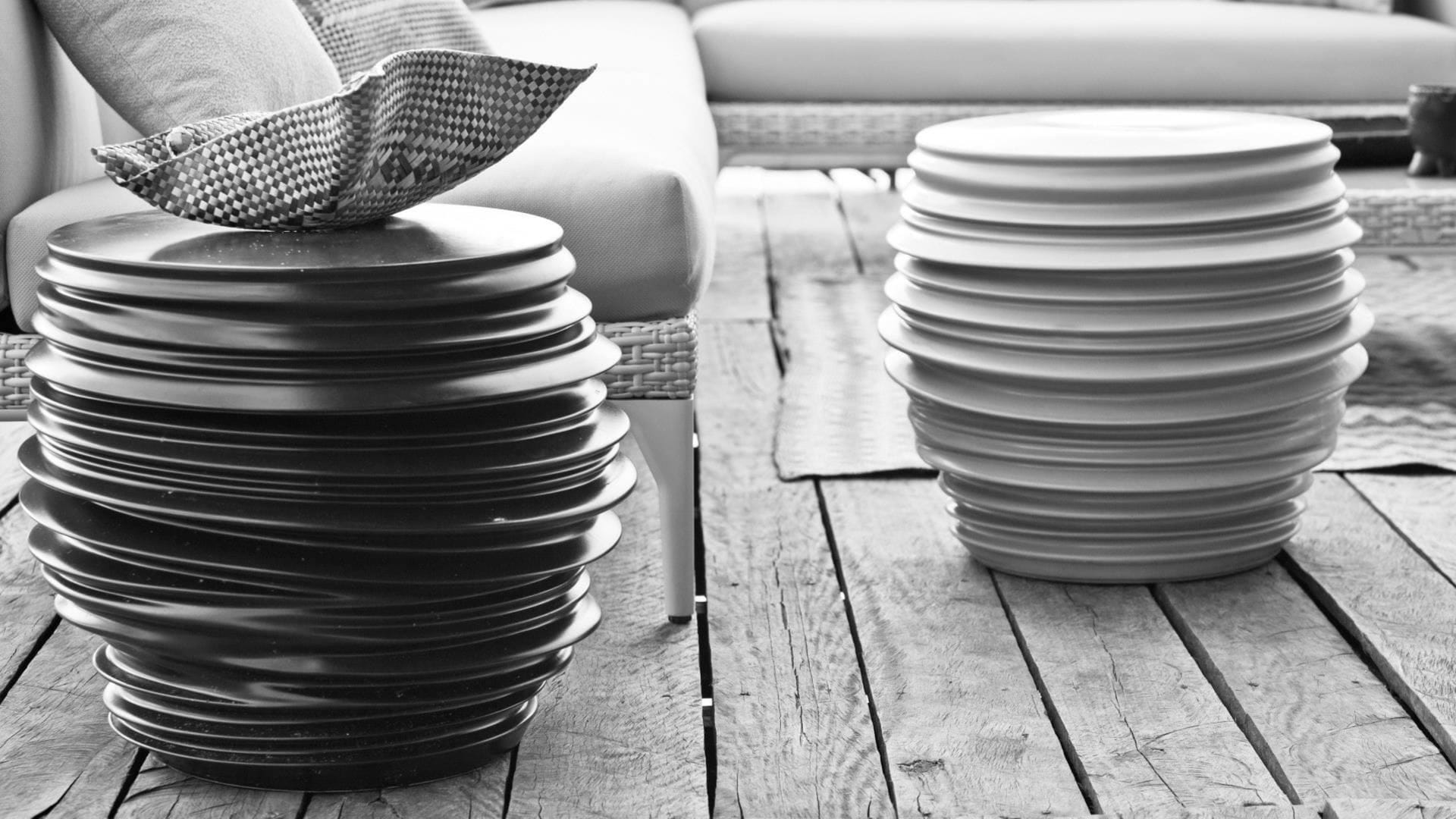 Characterized by its ribbed, asymmetrical, seemingly collapsing forms, BABYLON is the result of years of development and no shortage of imagination or perseverance. Among the ceramic side tables in mineral colors, the BABYLON collection includes extra-large planter, a side-table/stool in rotomolded polyethylene and, in the same sturdy design, rechargeable LED lighting unit with eight-step dimmer and handy remote control. Each product is offering a large variety of qualities: ceramic pieces are frost proof, non-absorbing, with excellent resistance to scratches, abrasion and indirect tensile stress, whereas polyethylene is 100% recyclable, light yet robust at the same time.